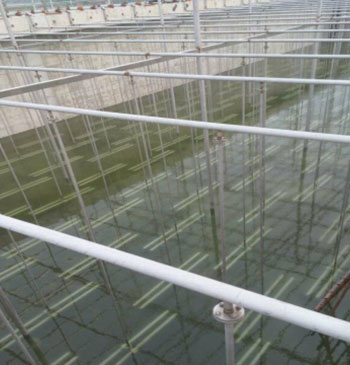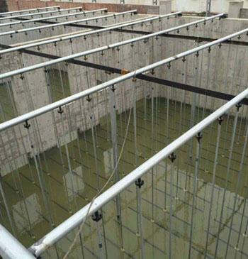 2、在已運(yùn)行的曝氣器的效率低或堵塞頻繁不便維修時(shí),可用懸掛鏈曝氣器進(jìn)行改造,提高增氧能力和攪拌效果。