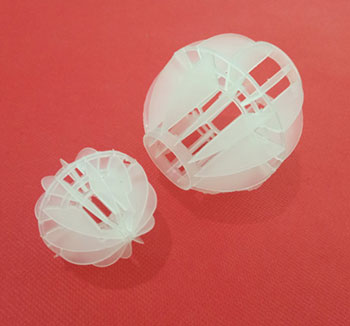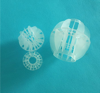多面空心球采用聚丙烯(PP)塑料制成球狀,由兩個半球合成一個球形,每個半球上根據(jù)設(shè)計需要有8-12個半扇形葉片,兩個半球的扇形葉片上下相互錯開上,沿中心軸呈放射形布置。
